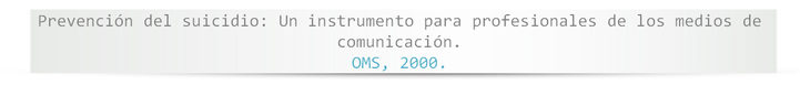 Aparte de esta documentación, desde 2000 la OMS ha venido editando valiosísimas guías de prevención del suicidio y todos sus ámbitos: sanitario, escolar, laboral, penitenciario, mediático... Pinchando en sus etiquetas se descargan directamente desde la web de la OMS: