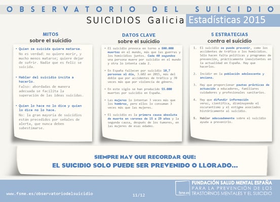 En 2015, se produjeron 318 suicidios en Galicia: un 72% de hombres y un 28% de mujeres. Ello supone una media de casi 1 suicidio al día.