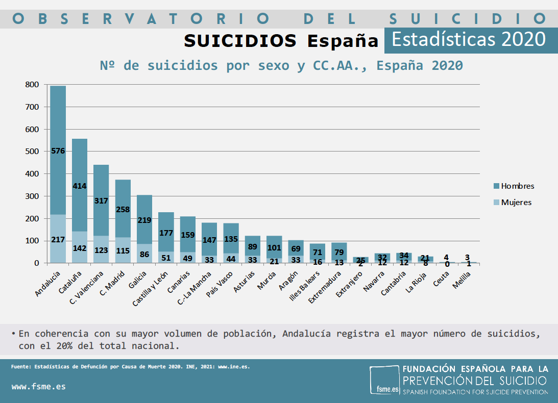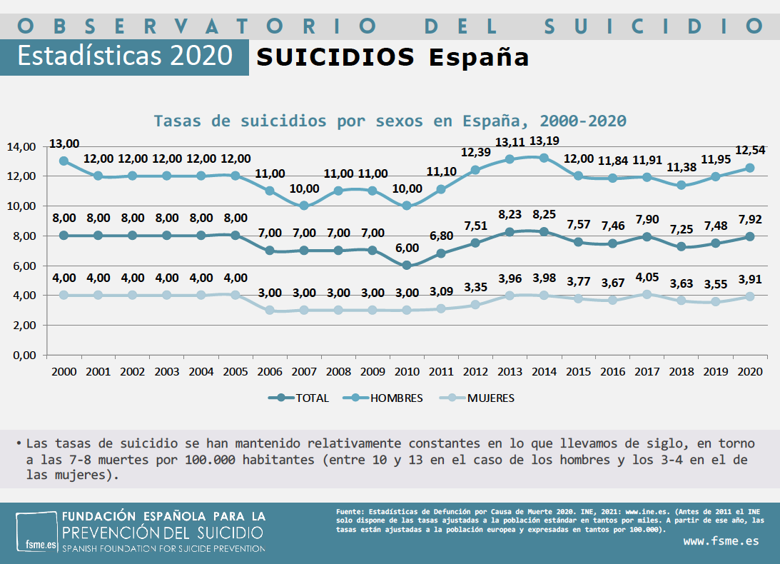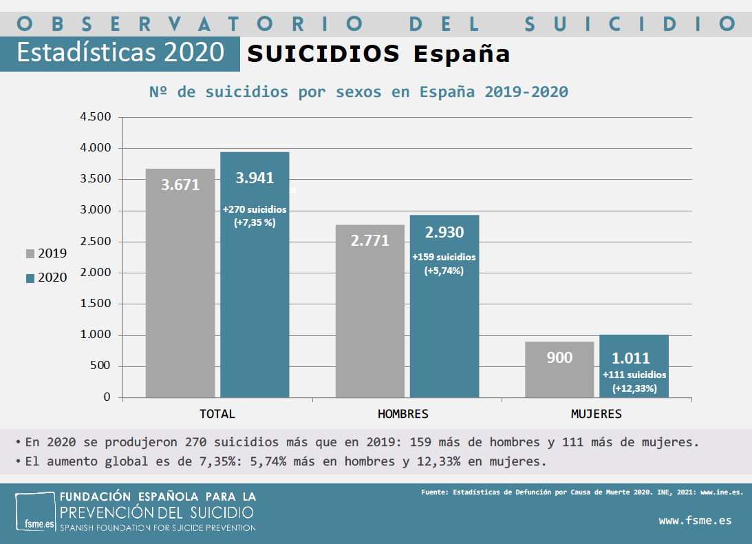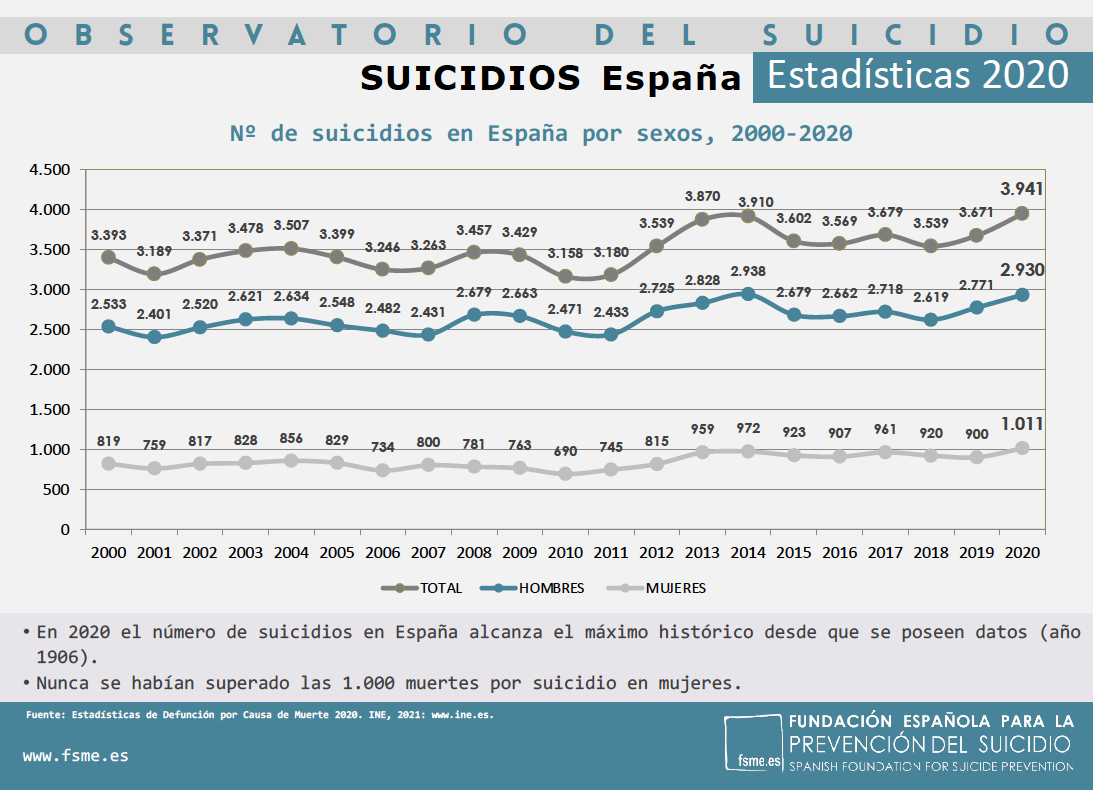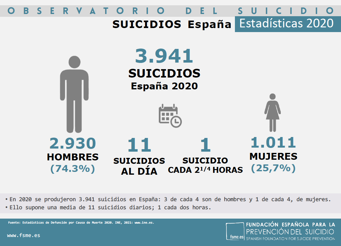 En 2020 han fallecido por suicidio 3.941 personas en España, una media de casi 11 personas al día; un 74% de ellas varones (2.938) y un 26% mujeres (1.011). Así, 2020 se convierte en el año con más suicidios registrado en la historia de España desde que se tienen datos (año 1906).