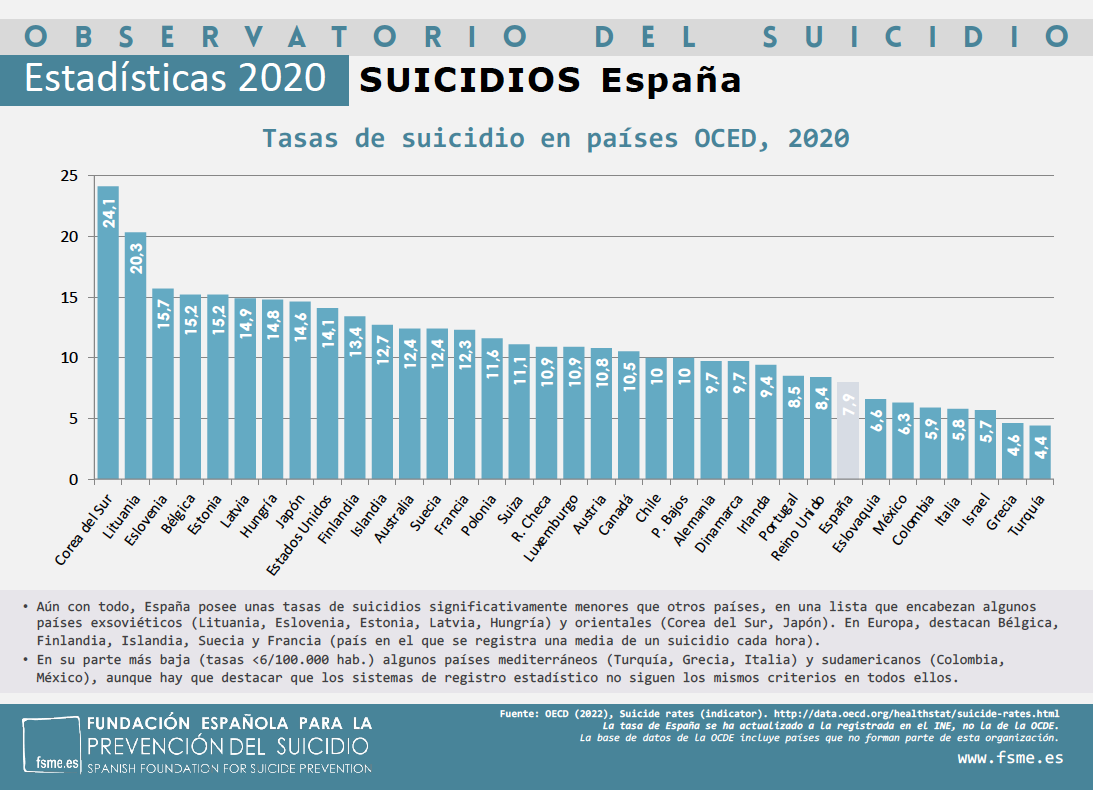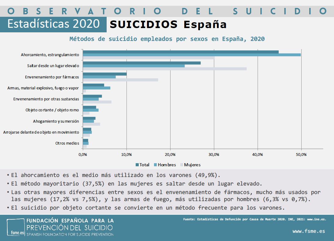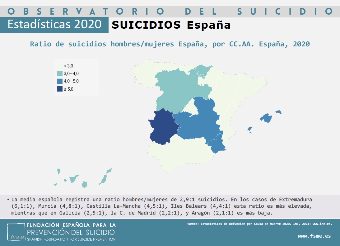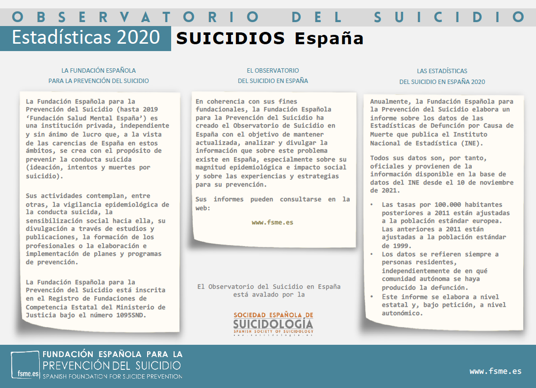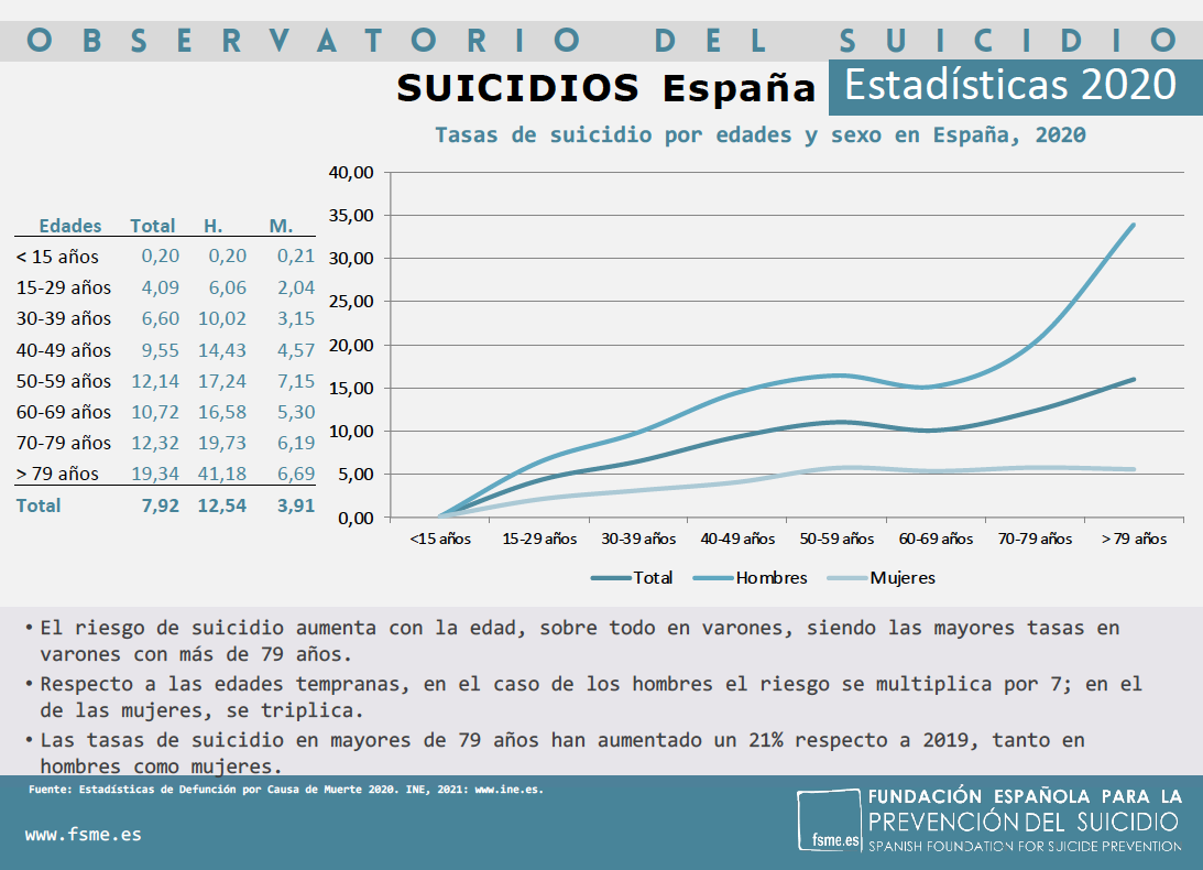 En 2020 han fallecido por suicidio 3.941 personas en España, una media de casi 11 personas al día; un 74% de ellas varones (2.938) y un 26% mujeres (1.011). Así, 2020 se convierte en el año con más suicidios registrado en la historia de España desde que se tienen datos (año 1906).