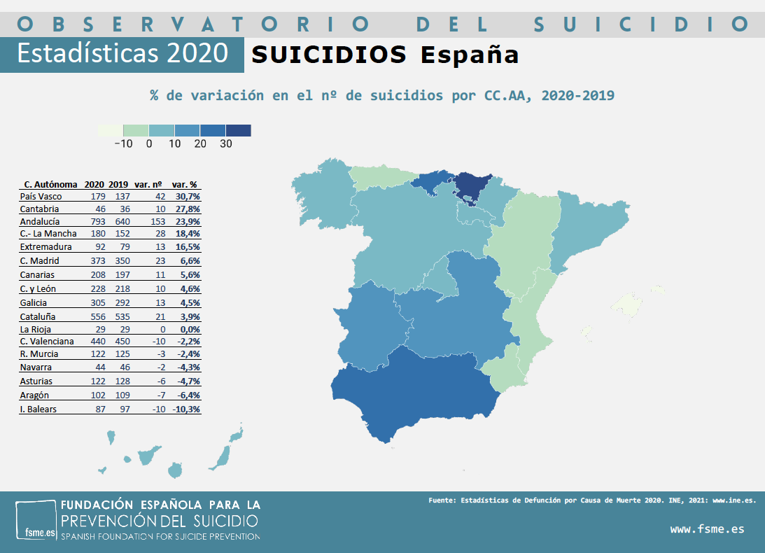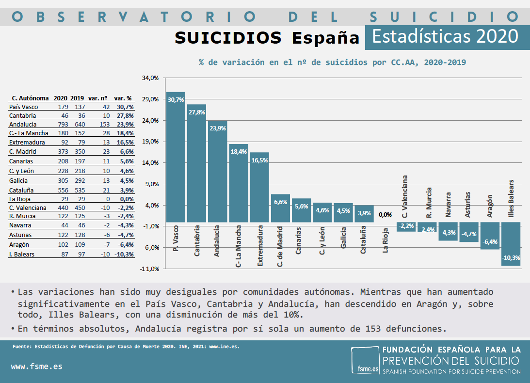 Por comunidades autónomas, mientras el número de suicidios han aumentado significativamente en el País Vasco (un 30%), Cantabria y Andalucía, han descendido en Aragón y, sobre todo, Illes Balears, con una disminución de más del 10%.