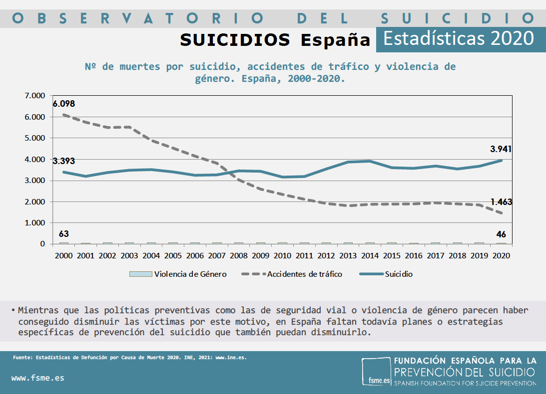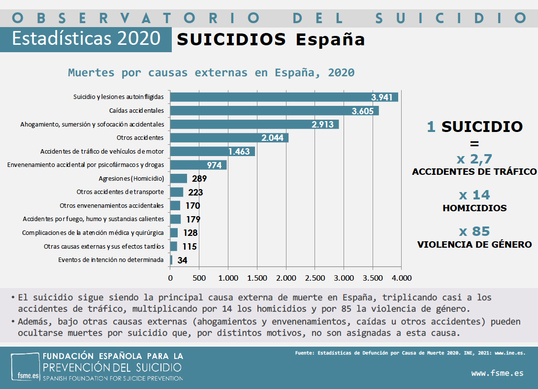 El suicidio es la principal causa de muerte no natural en España, produciendo 2,7 veces las provocadas por accidentes de tráfico, 13,6 veces más que los homicidios y casi 90 veces más que la violencia de género.