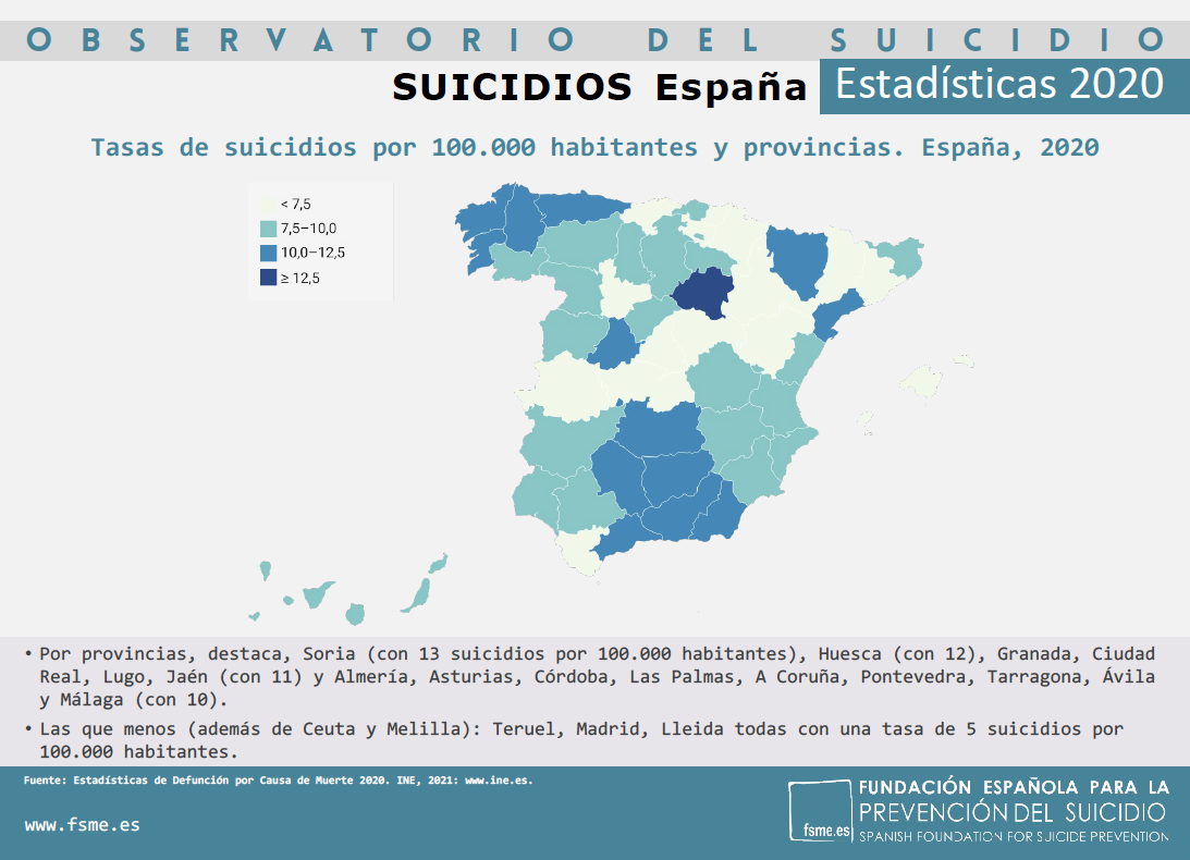 Por provincias, destaca, Soria con 13 suicidios por 100.000 habitantes, Huesca con 12 suicidios por 100.000 habitantes, seguidas por Granada, Ciudad Real, Lugo, Jaén con 11 por 100.000 habitantes.