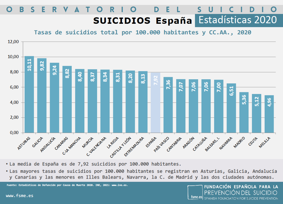 Las mayores tasas de suicidios por 100.000 habitantes se registran en Asturias, Galicia, Andalucía y Canarias y las menores en Illes Balears, Navarra, la C. de Madrid y las dos ciudades autónomas. La tasa de suicidios media de España es de 7,92 suicidios por 100.000 habitantes.