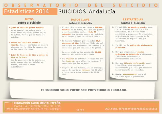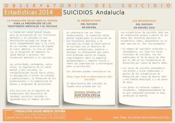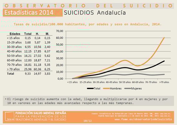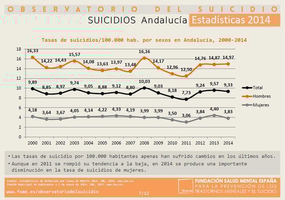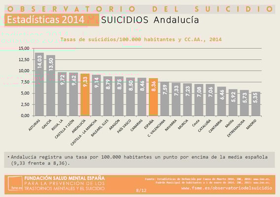 1 de cada 5 suicidios que se producen en España es de residentes andaluces, lo que la convierte en la primera comunidad autónoma de muertes por esta causa y la quinta en relación a su población, con una tasa de 9,3 suicidios por 100.000 habitantes (frente a 8,3 de la media estatal).