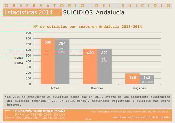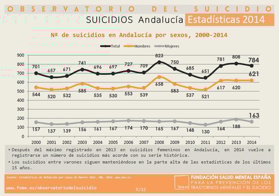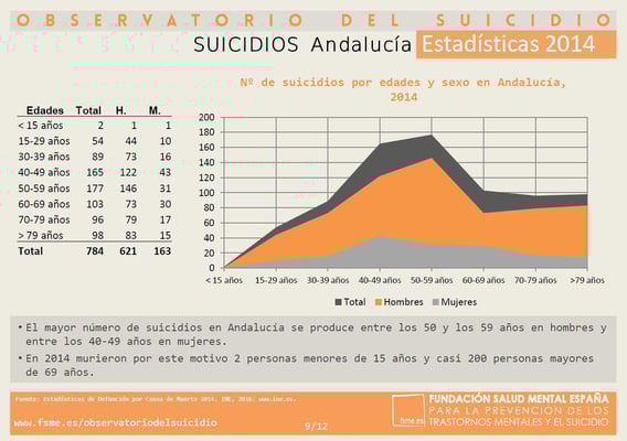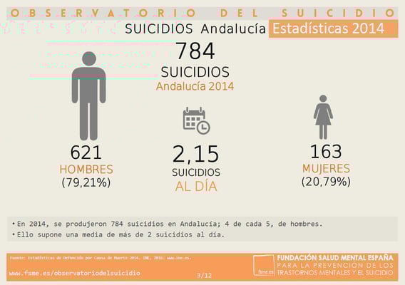 En 2014 han fallecido por suicidio 784 andaluces, más de 2 personas al día; un 80% de ellas varones (621) y un 20% mujeres (163).