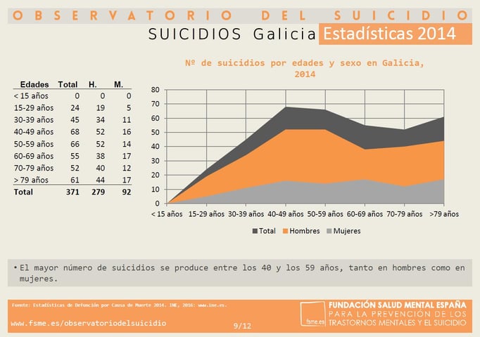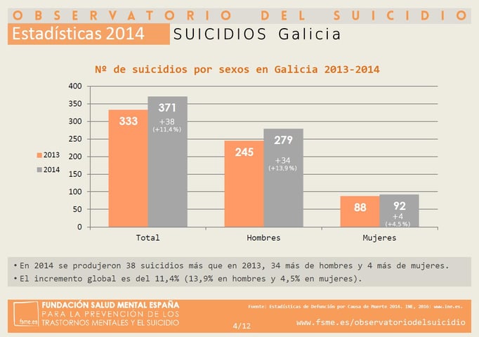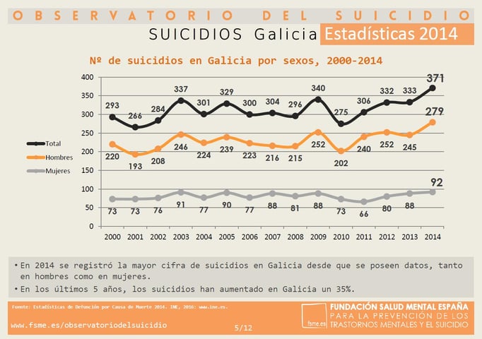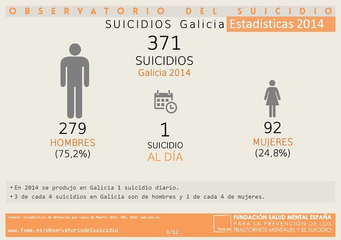 En 2014 han fallecido por suicidio 371 gallegos, 1 persona al día; un 75% de ellas varones (279) y un 25 mujeres (92).