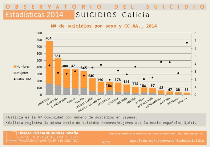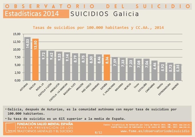 Casi 1 de cada 10 suicidios que se producen en España es de residentes gallegos, lo que la convierte en la cuarta comunidad autónoma de muertes por esta causa y la segunda en relación a su población, con una tasa de 13,5 suicidios por 100.000 habitantes, que supera en un 60% la media estatal de 8,4, y que es también la tasa más alta registrada en las estadísticas por suicidio en Galicia.