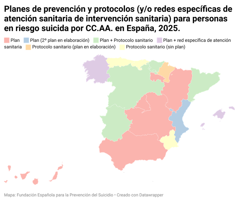 La situación es la siguiente: pueden existir comunidades autónomas que posean un plan de prevención de la conducta suicida; puede que tengan un protocolo o código sanitario que organice y defina las acciones sanitarias al respecto y puede que tenga ambas herramientas. Es posible que algunas posean, además de plan y/o protocolo sanitario, una red específica de atención sanitaria a pacientes en riesgo suicida.